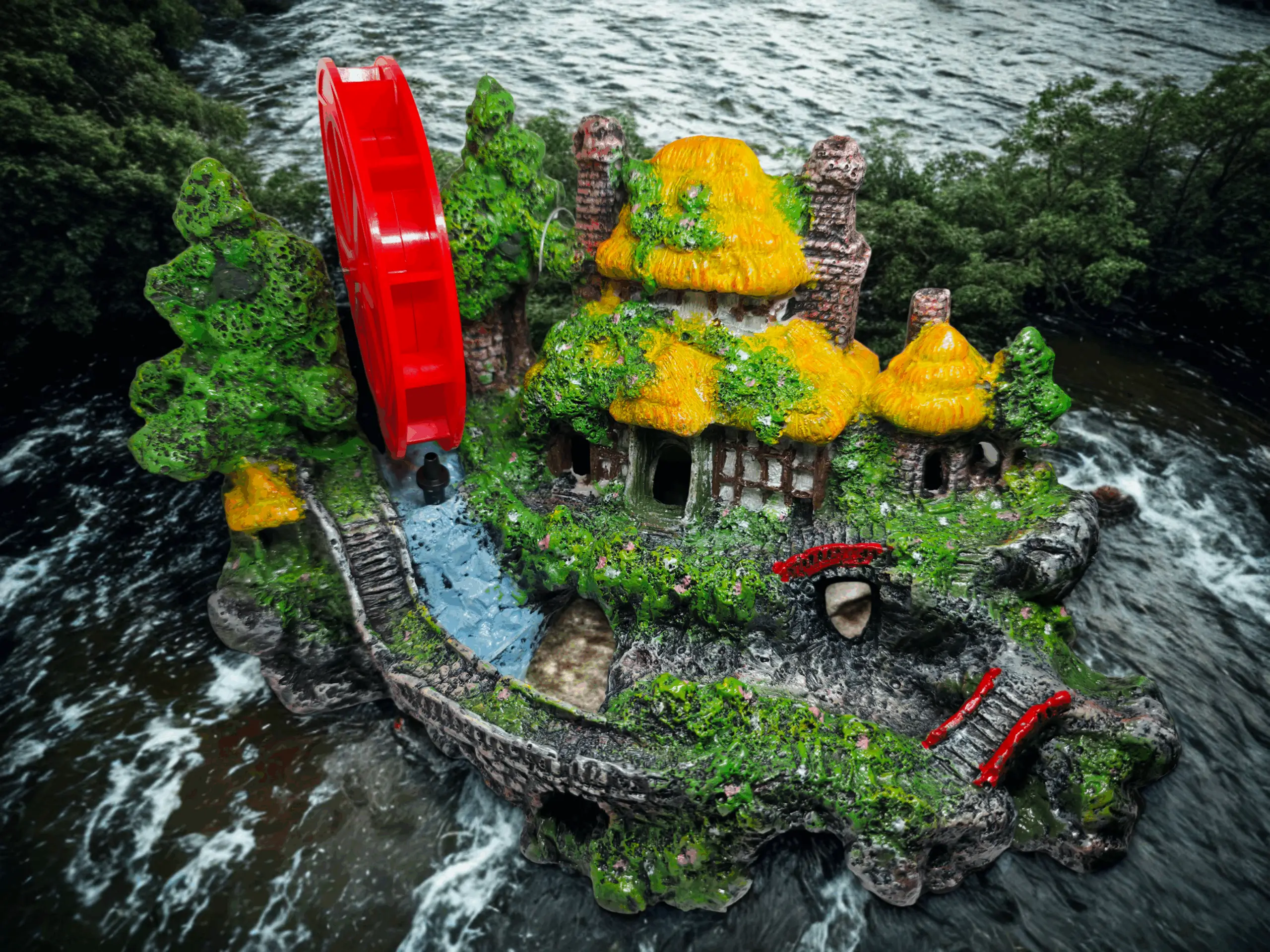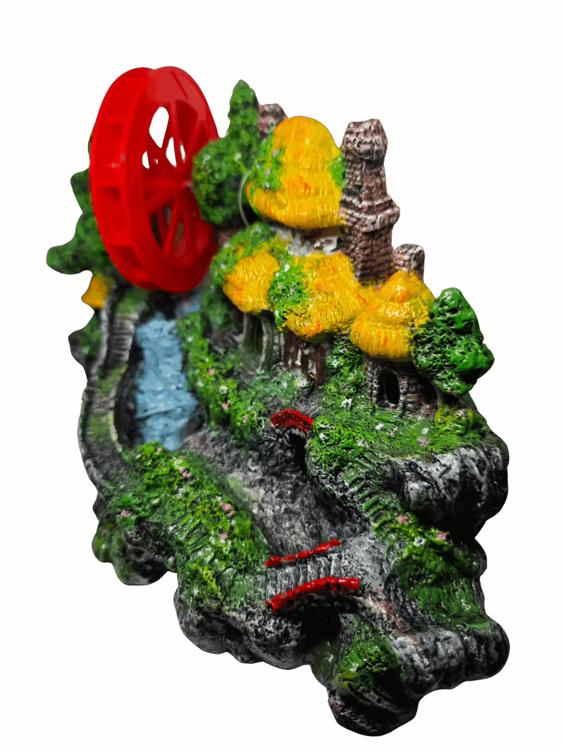 Enhance the charm and visual appeal of your aquarium with this intricately designed Plastic House with Spinning Watermill. Crafted from high-quality, non-toxic plastic, this decorative piece is safe for both freshwater and marine environments. The built-in spinning watermill adds dynamic movement to your aquascape, creating a captivating focal point while contributing to a naturalistic setting for aquatic inhabitants.