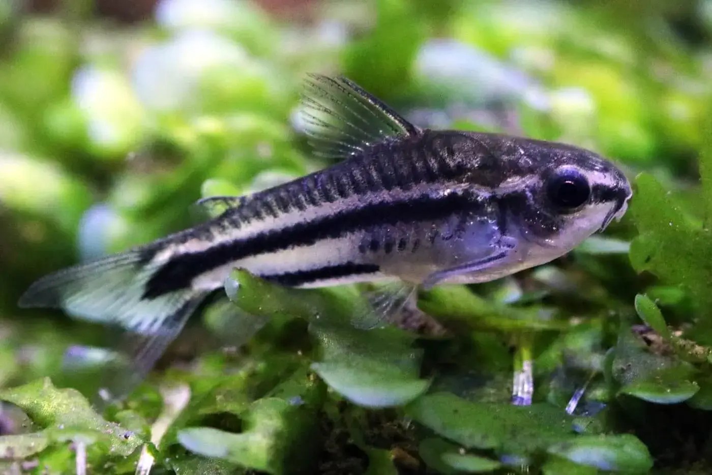 The Pygmy Cory (C. pygmaeus) is a small, adorable South American fish, growing to just 1 inch (2.5 cm) in length. With its silvery body and a black stripe, it stands out due to its large black eyes and whisker-like barbels. Unlike most corydoras, which are bottom dwellers, pygmy corys hover midwater by flapping their fins, resembling an underwater hummingbird.