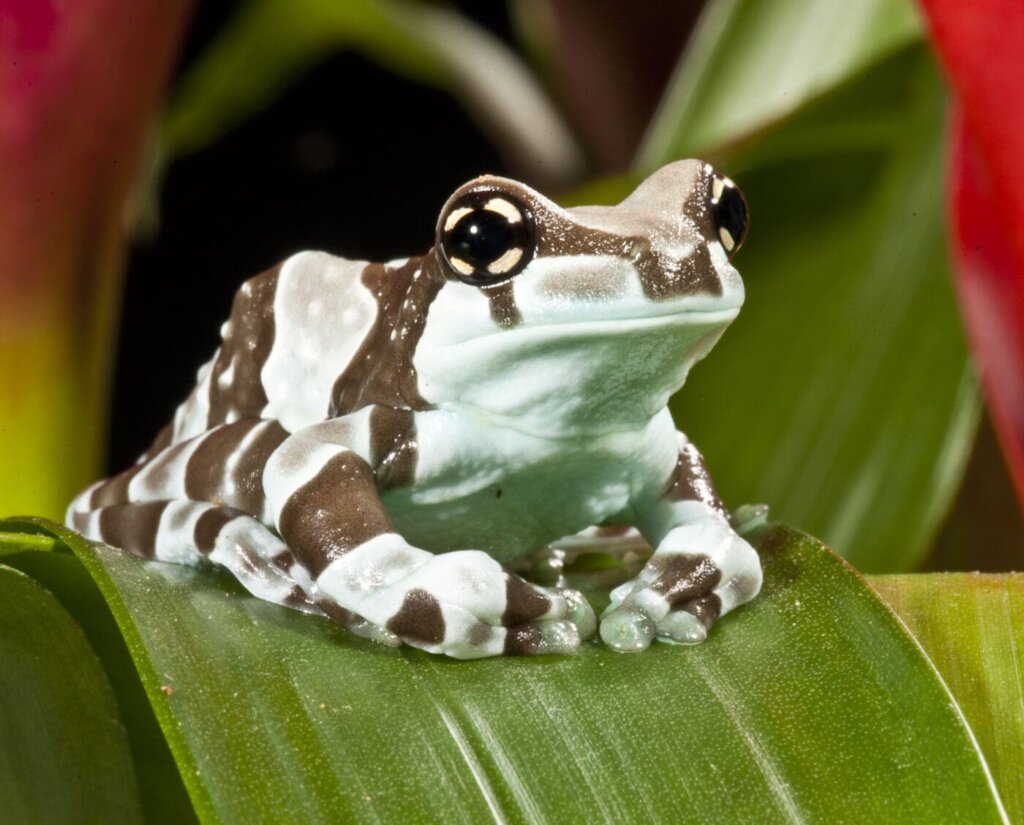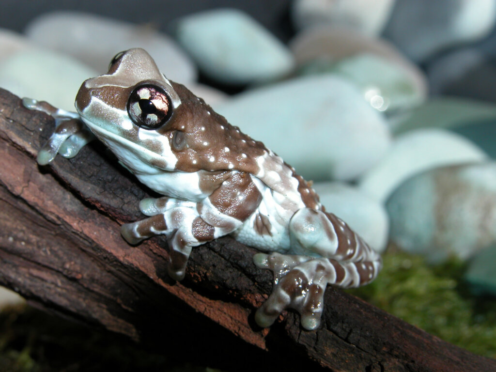 Amazon Milk Frogs are adorable, long-lived, and easy-to-care-for amphibians. Their engaging personalities, bluish-green color with distinct brown-to-black patterns, blueish lips and toe pads, and big golden eyes make them appealing display animals for both beginning reptile enthusiasts and advanced hobbyists. Amazon Milk Frogs live an arboreal lifestyle, sleeping on branches or in bark crevices and hollow tree trunks, always near water-filled tree holes that they use for reproduction.